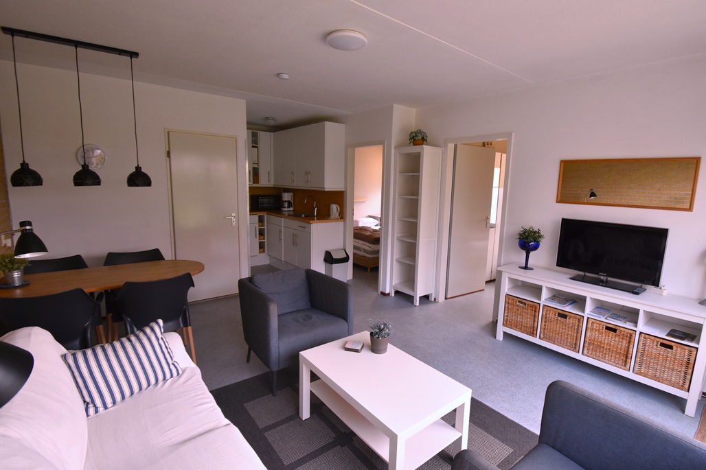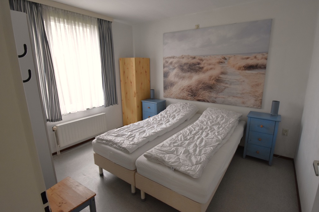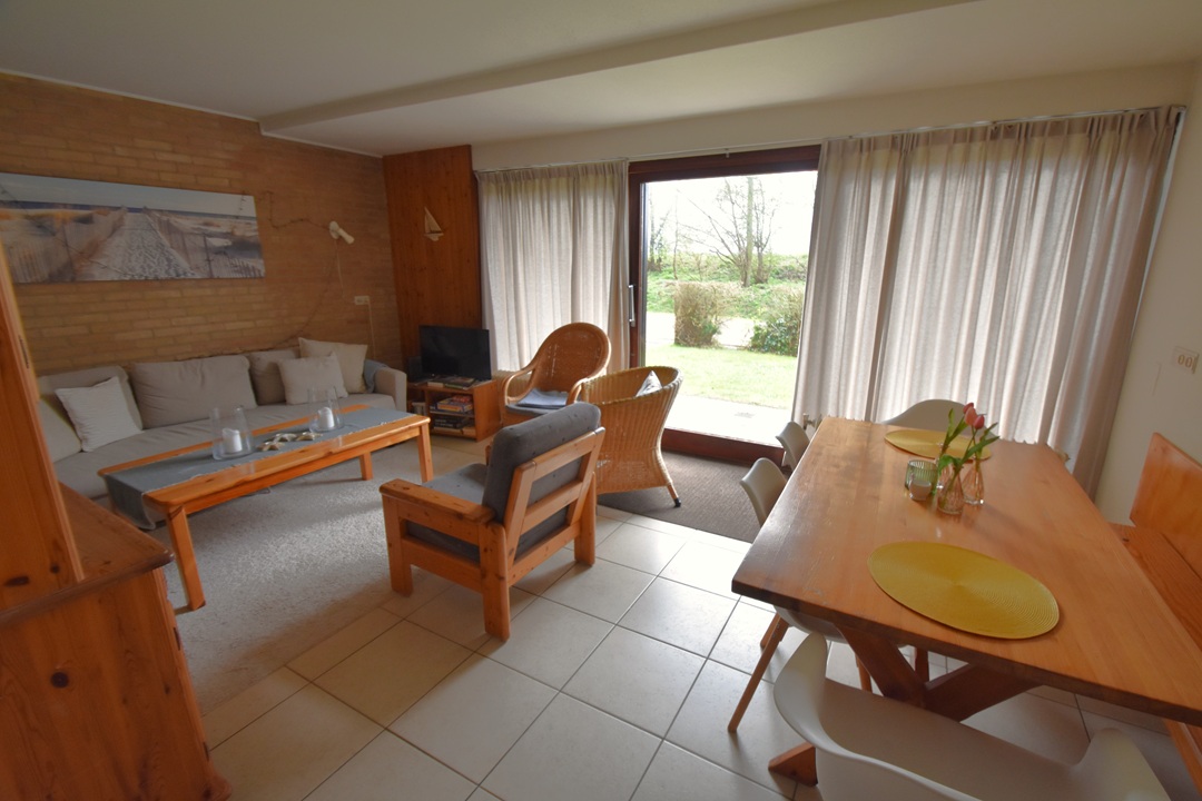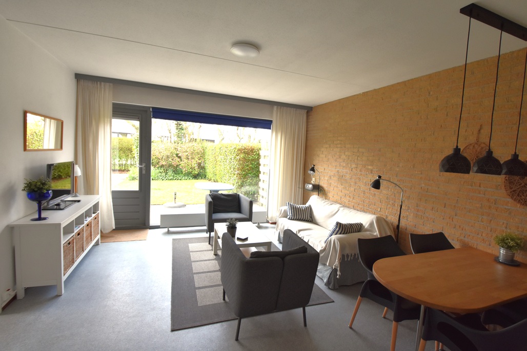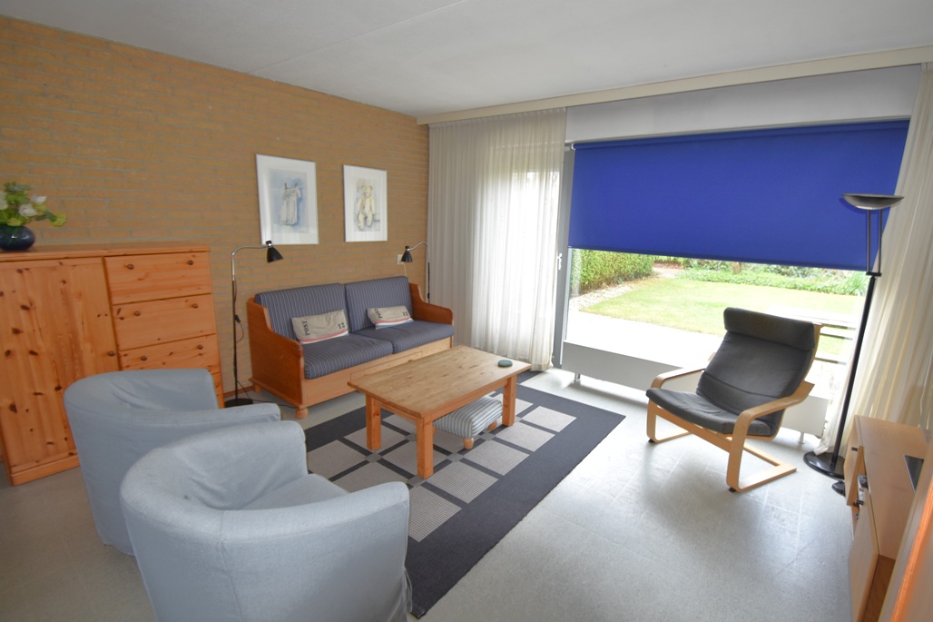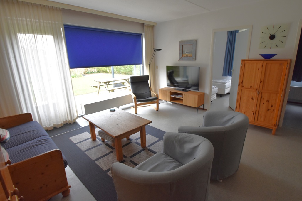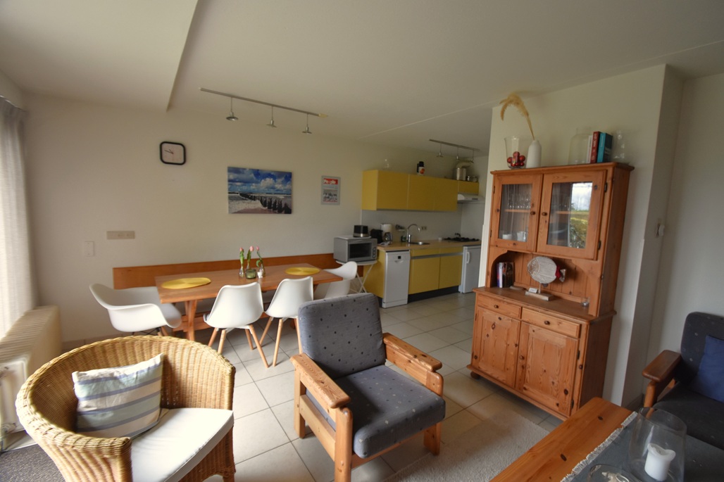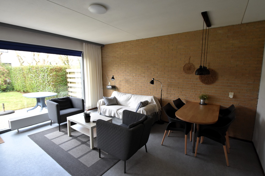 hal, woonkamer met zithoek en eettafel, open keuken, 2 slaapkamers:  1 slaapkamer met 2 eenpersoonsbedden, 1 slaapkamer met 2 eenpersoonsbedden, badkamer met douche en wastafel, apart toilet, ingang appartement via tuin en terras met tuinmeubelen