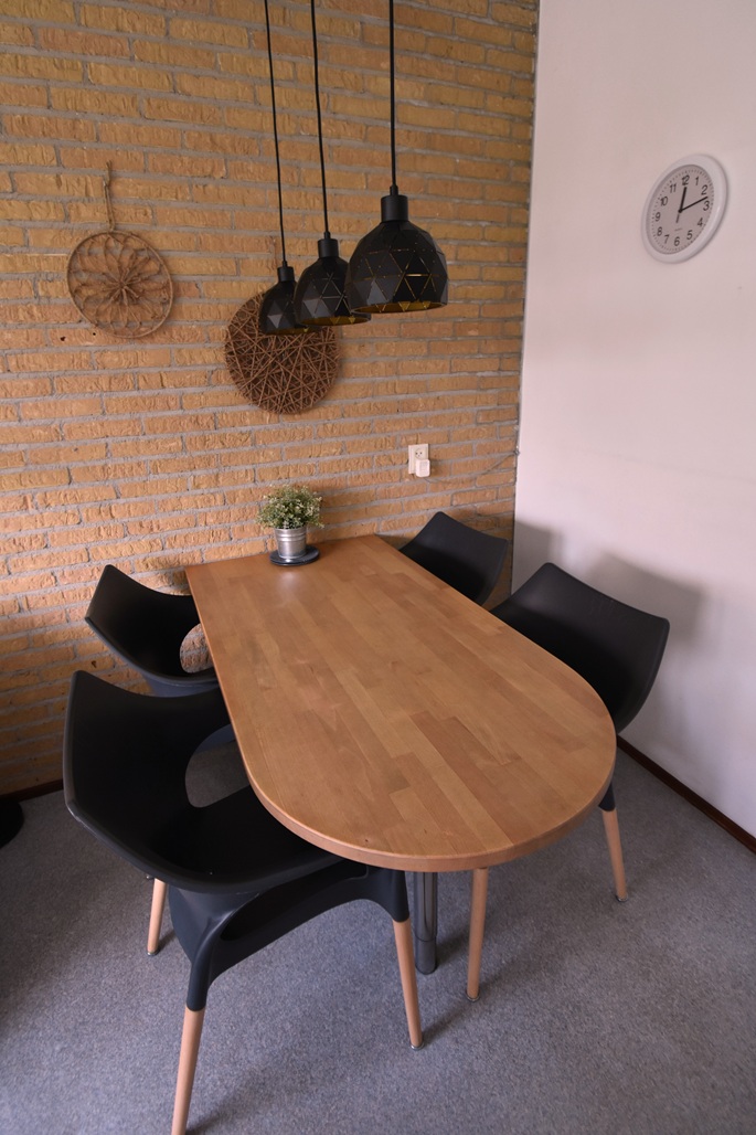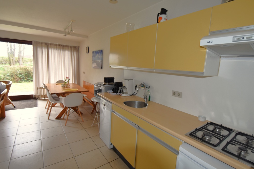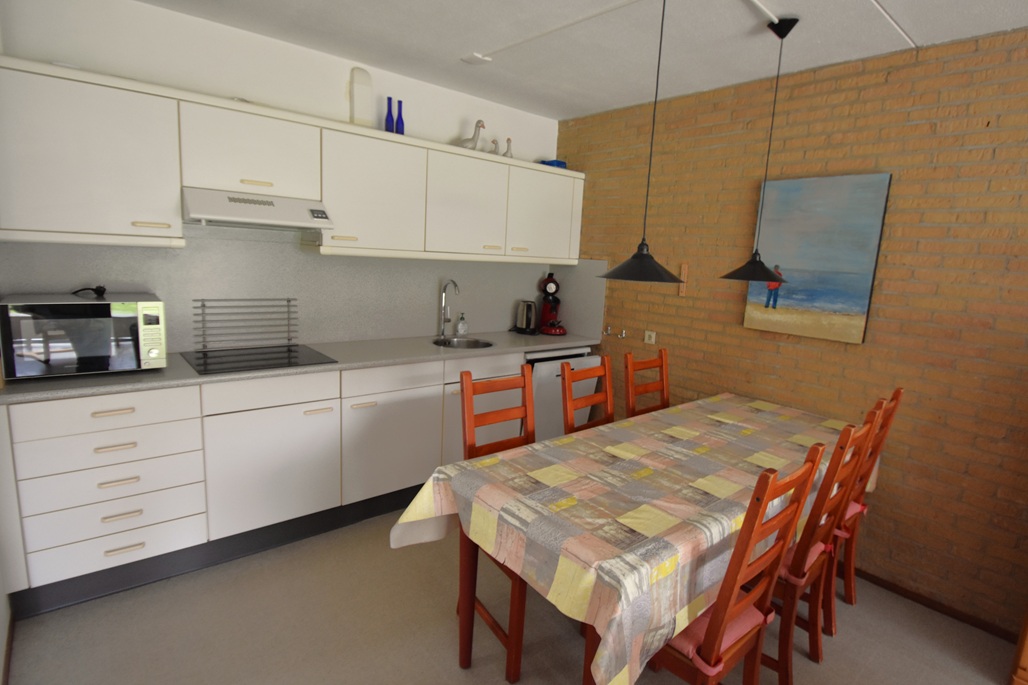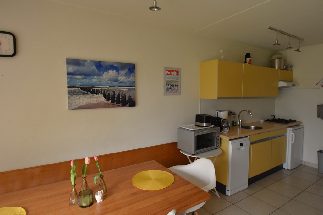 hal, woonkamer met zithoek, open keuken met eettafel,3 slaapkamers: 1 slaapkamer met 2 eenpersoonsbedden, slaapkamer met 1 stapelbed, 1 slaapkamer met 2 eenpersoonsbedden, badkamer met douche en wastafel, aparte toilet, via tuindeur in de woonkamer is de tuin met terras met tuinmeubelen en picknick bank toegankelijk