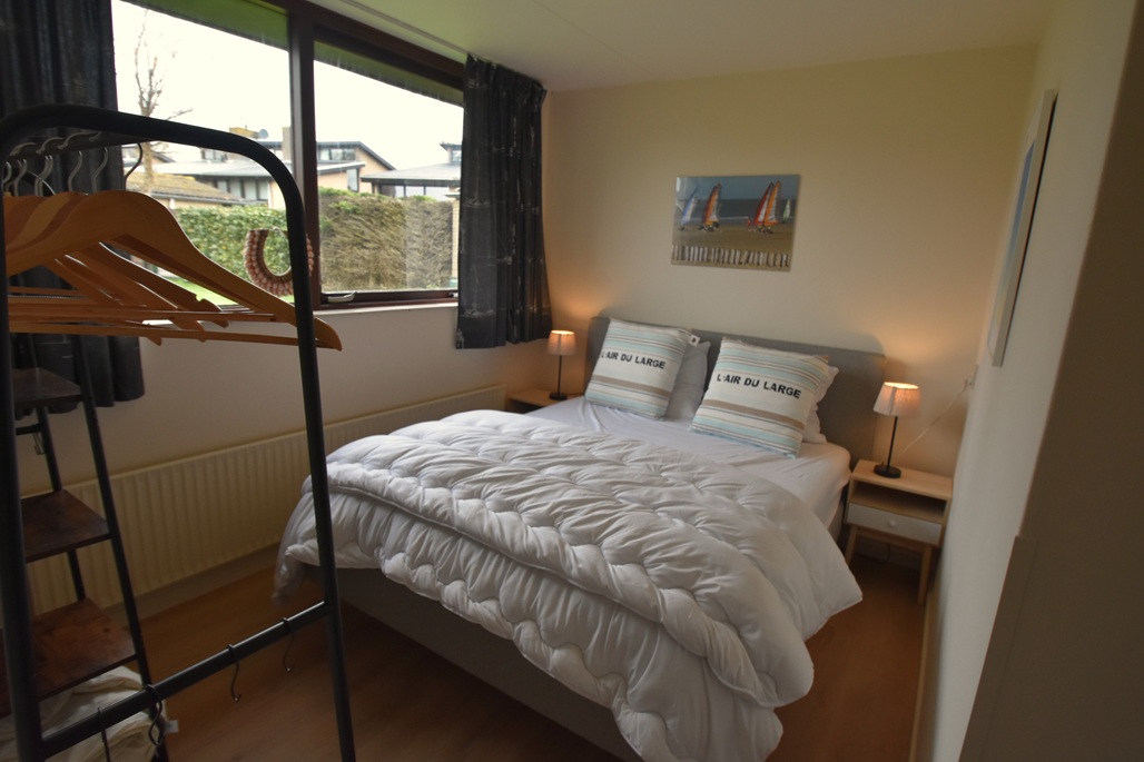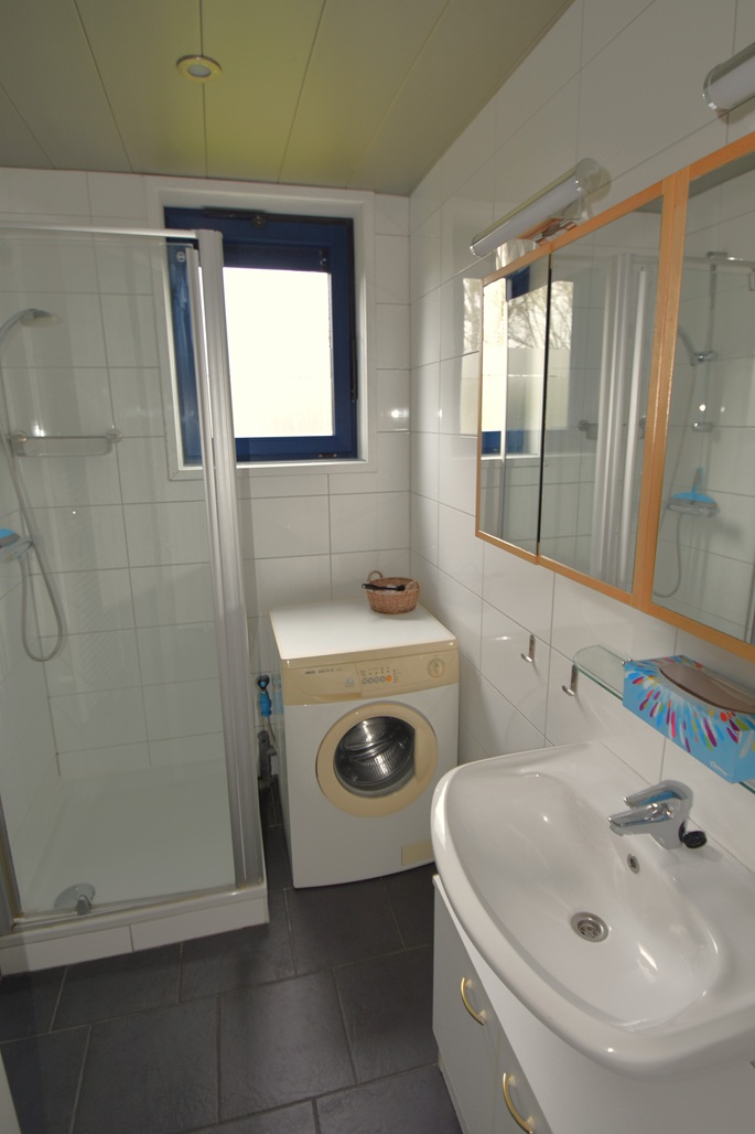 hal, badkamer met douche en wastafel, 1 slaapkamers met 1 tweepersoons boxspringbed (180×200 m met 2 matrassen 90×200), kleuren tv  en eigen wastafel, 1 slaapkamer met 2 eenpersoons boxspringbedden (90x200m) apart toilet, woonkamer met zithoek en eettafel, kleuren tv (met extra Duitse zenders) open keuken, schuifpui naar tuin met terras en berging ( met mogelijkheid om elektrisch fietsen op te laden).