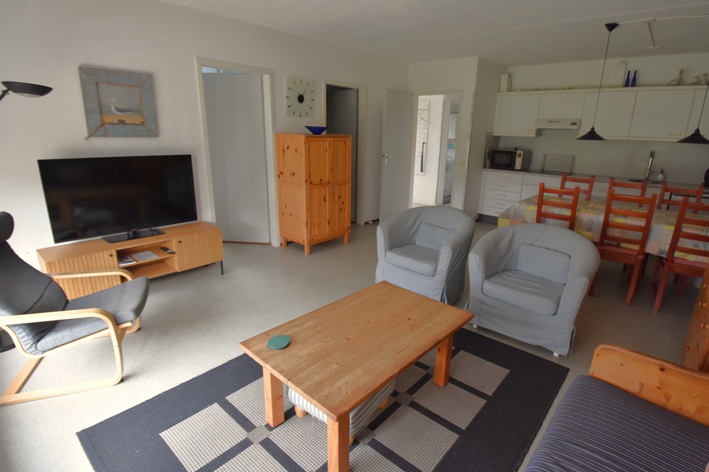 woonkamer met zithoek en eettafel, open keuken, 2 slaapkamers met elk 2 eenpersoonsbedden, badkamer me douche en wastafel, aparte toilet, schuifpui naar zonnig balkon