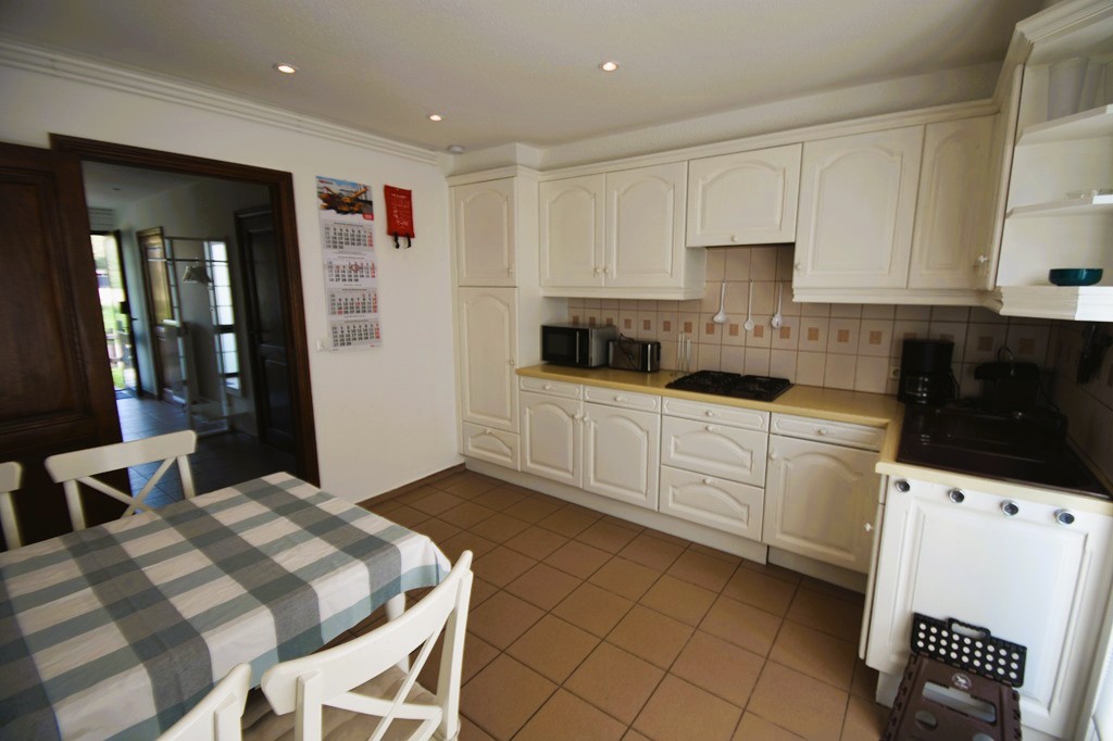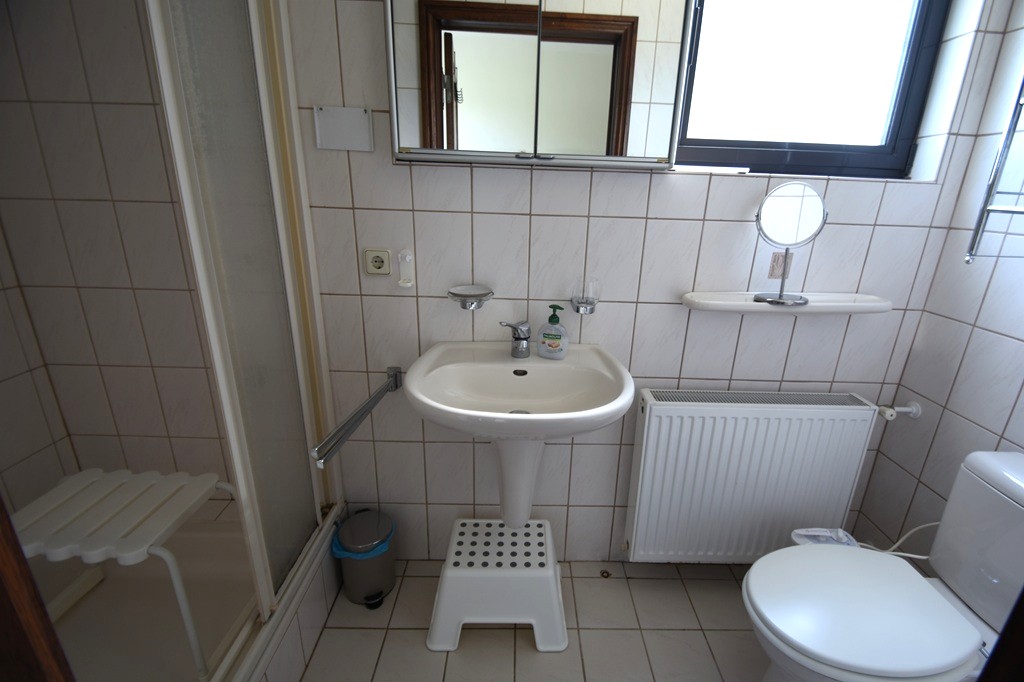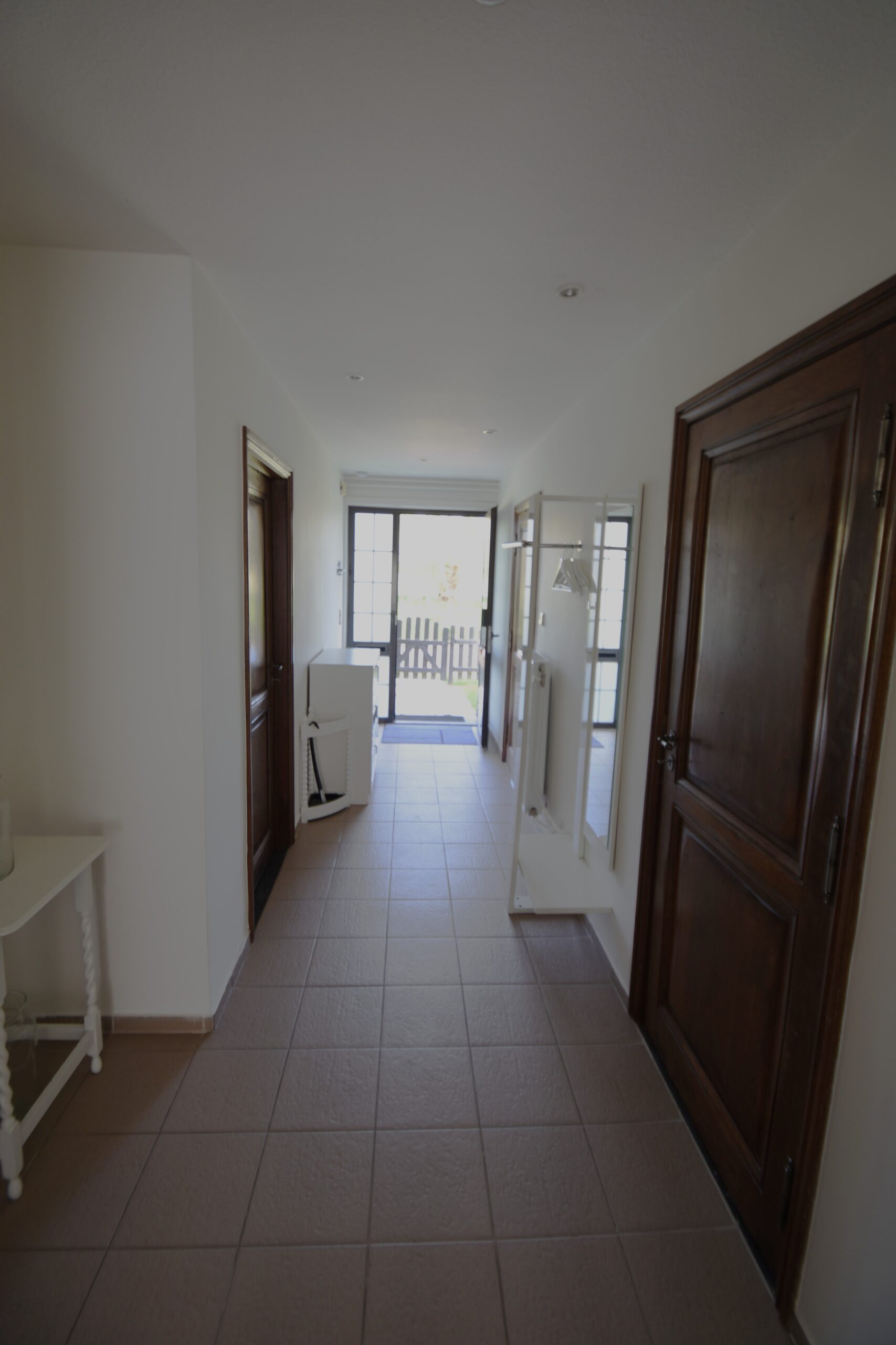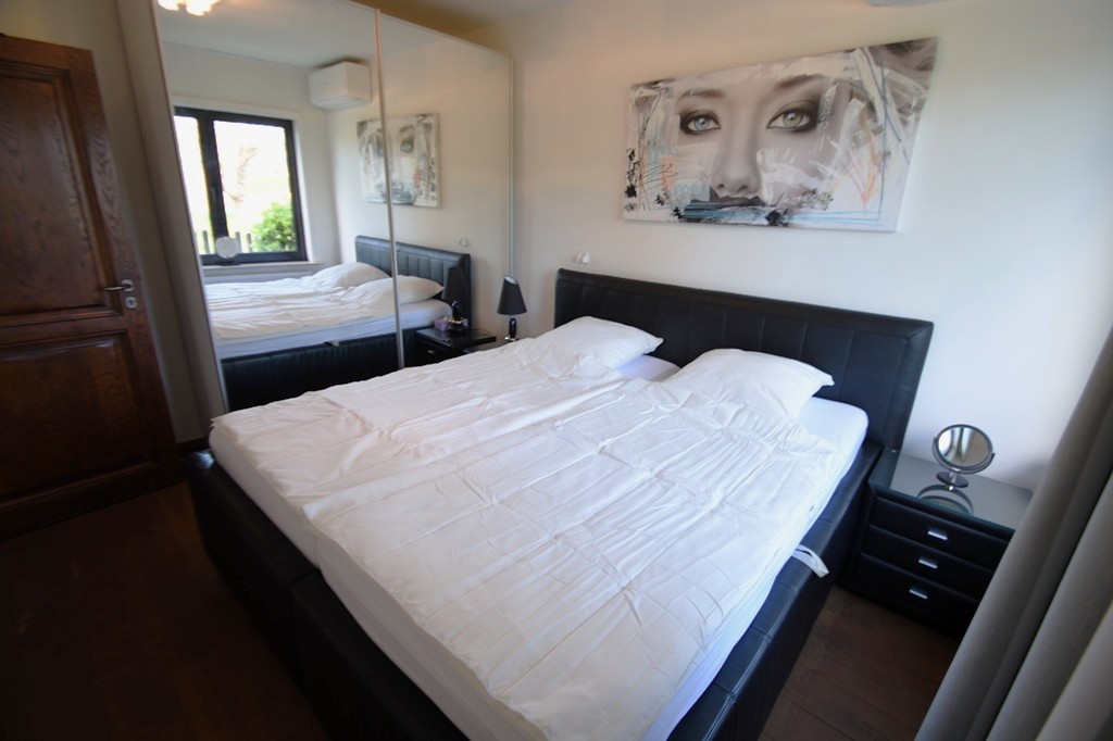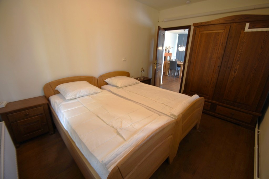 Flur, 1 Schlafzimmer mit Doppelbett mit 2 Matratzen 90×200, Badezimmer mit Dusche, Waschbecken und Toilette, separate Küche, Wohnzimmer mit Sitzecke/Schlafkautsch und Esstisch, 1 Schlafzimmer mit 1 Doppelbett mit 2 Matratzen 90×200 Schiebetüren zum Garten mit Terrasse mit Gartenmöbeln.