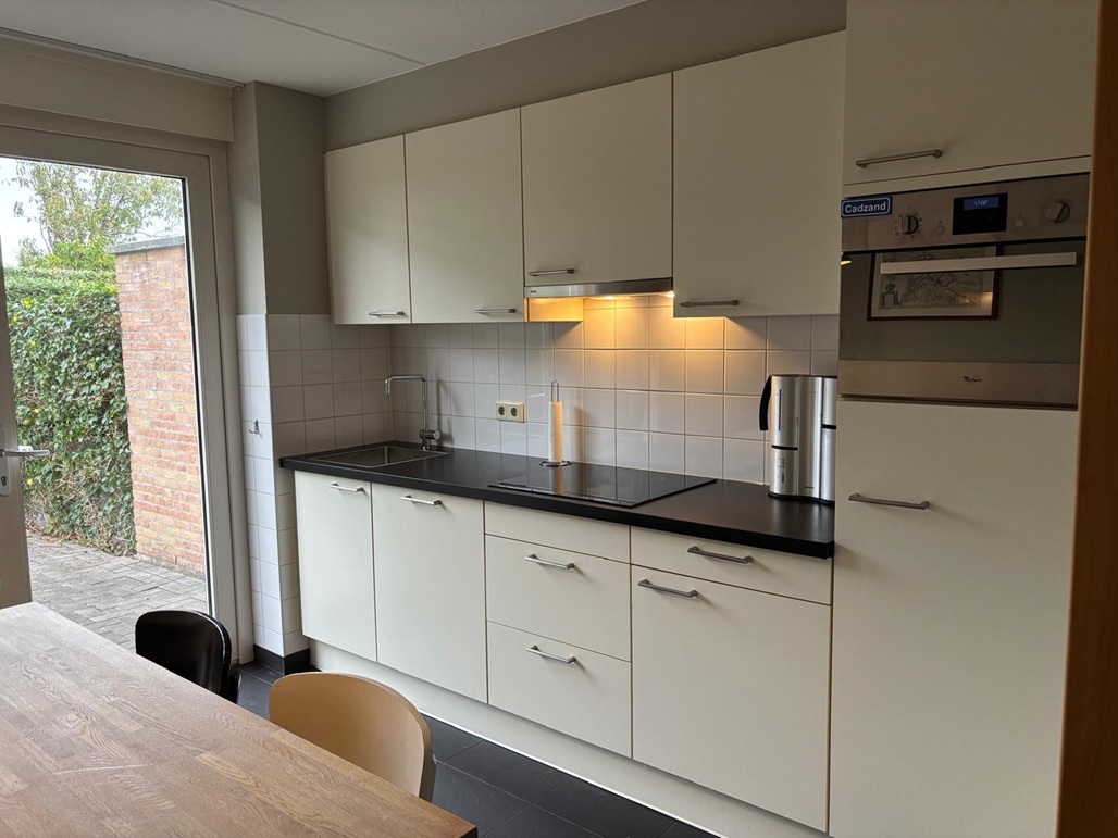 hal, apart toilet, woonkamer met zithoek, open keuken met eethoek, tuindeuren aan zowel de voorzijde als aan de achterzijde naar tuin met terras, opberghok met met wasmachine