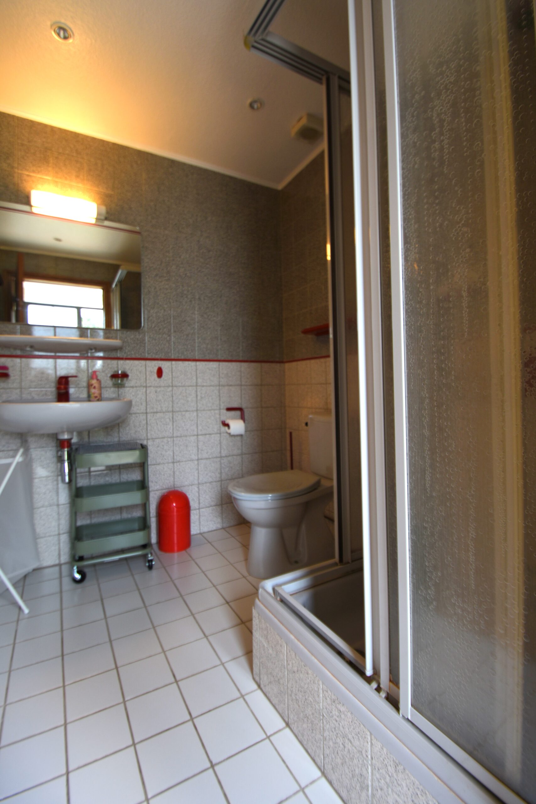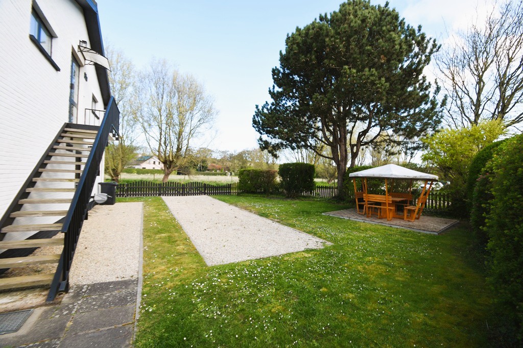 inkom hal, apart toilet, badkamer met apart bad, aparte douche en wastafel, woonkamer met zithoek en eettafel, open keuken, schuifpui naar kleine tuin met terras met tuinmeubelen en zonnescherm, trap naar 1e verdieping